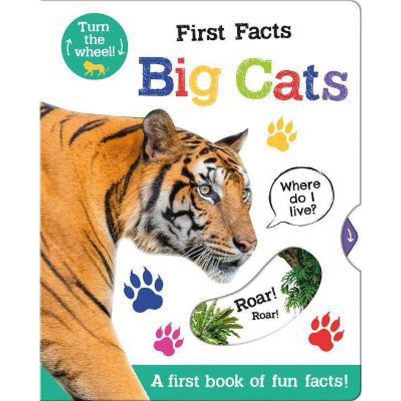 Discover first big cat facts with this fun and interactive turn-the-wheel book. Learn about different big cats by moving and turning the wheels in this fun non-fiction book. First facts are presented through simple questions for the reader to solve by turning a card wheel to discover the correct answers. The realistic illustrations provide lots of fascinating wild animal detail for children to look at and capture their imaginations, and there are seven wheels to move for plenty of turn-the-wheel fun! Sturdy card pages feature rounded corners, and the child-friendly card wheels are perfect for little ones to move, turn, and learn from!   A perfect series for introducing your toddler to first facts about big cats.