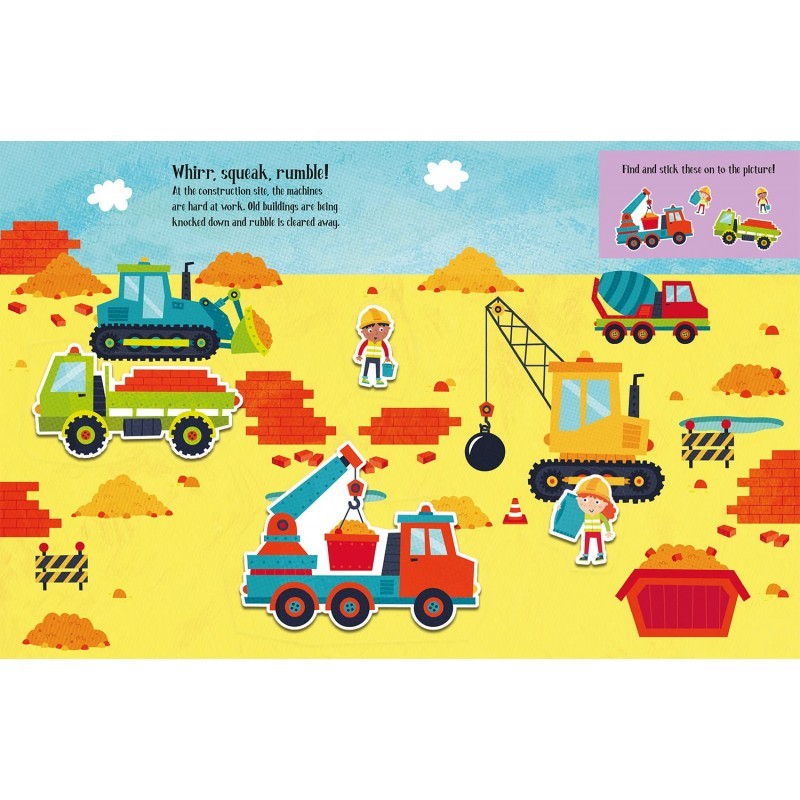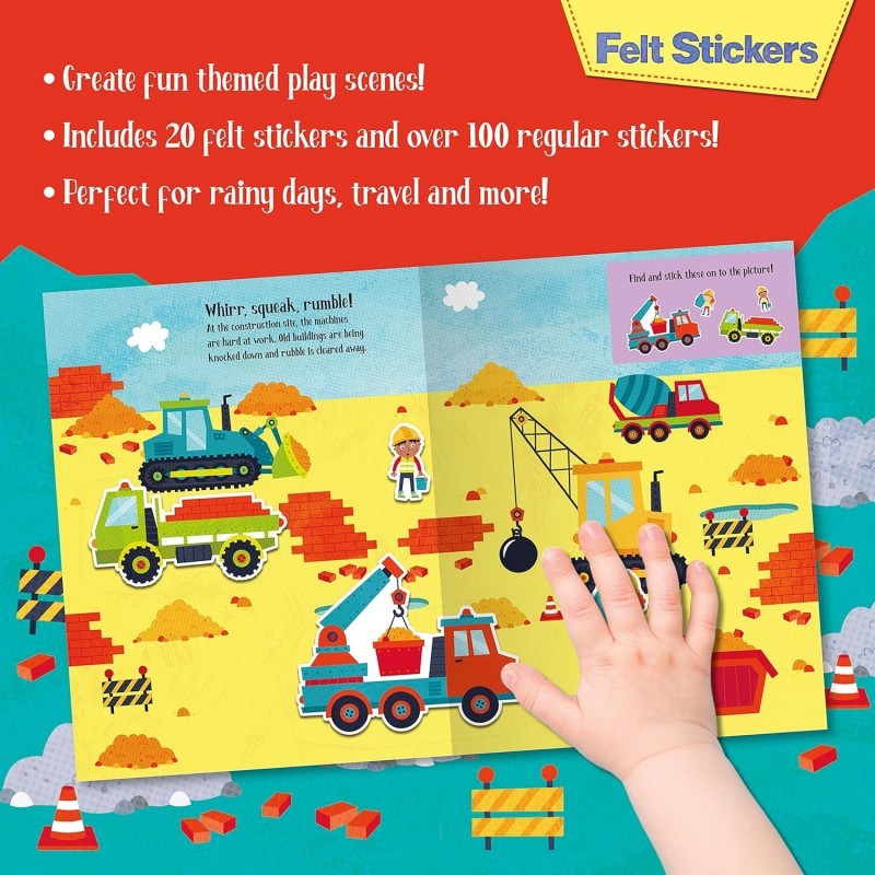 Create busy construction pictures with over 100 stickers and have sticker fun with the 20 felt stickers that you can use to decorate your stuff!Get ready for felt sticker fun with the diggers and dumpers! This innovative book includes 20 work machine felt stickers that you can use anywhere you like. Plus, there are over 100 colourful stickers to find, choose and position on the 12 construction-themed play scenes. With diggers, tractors, dumpers, trucks, giant construction vehicles, mega machines and more, creating construction pictures has never been so much fun!